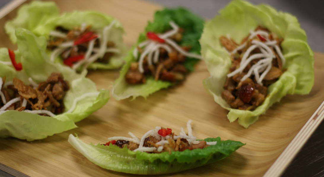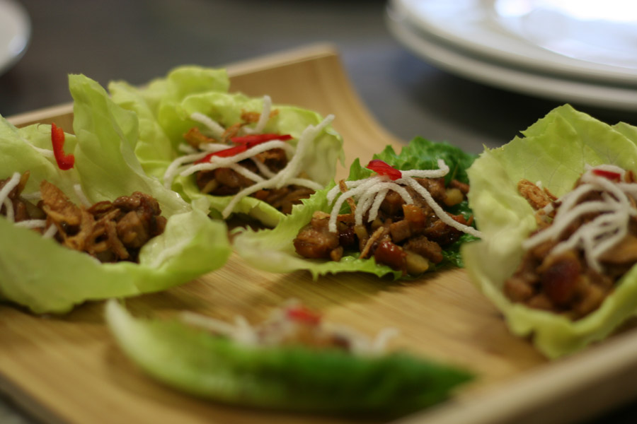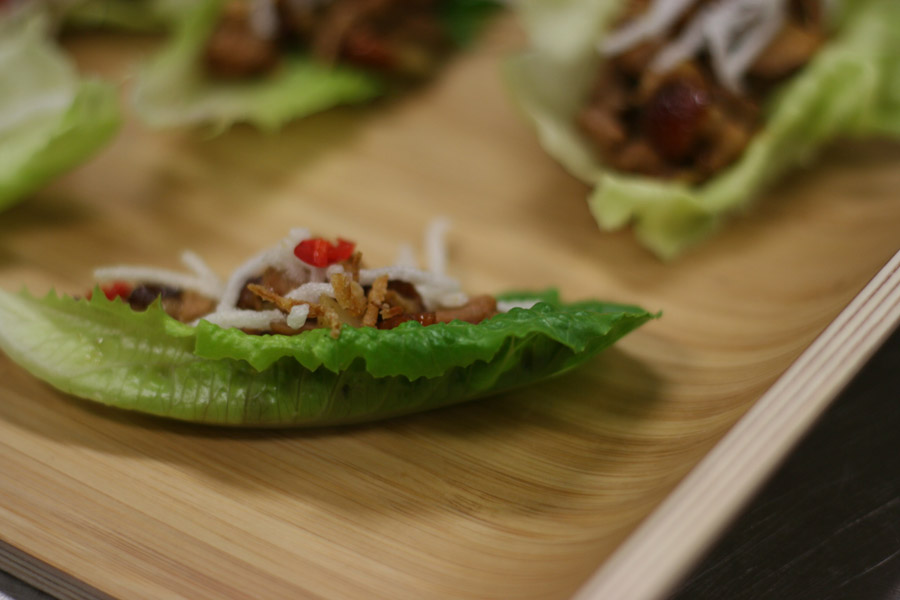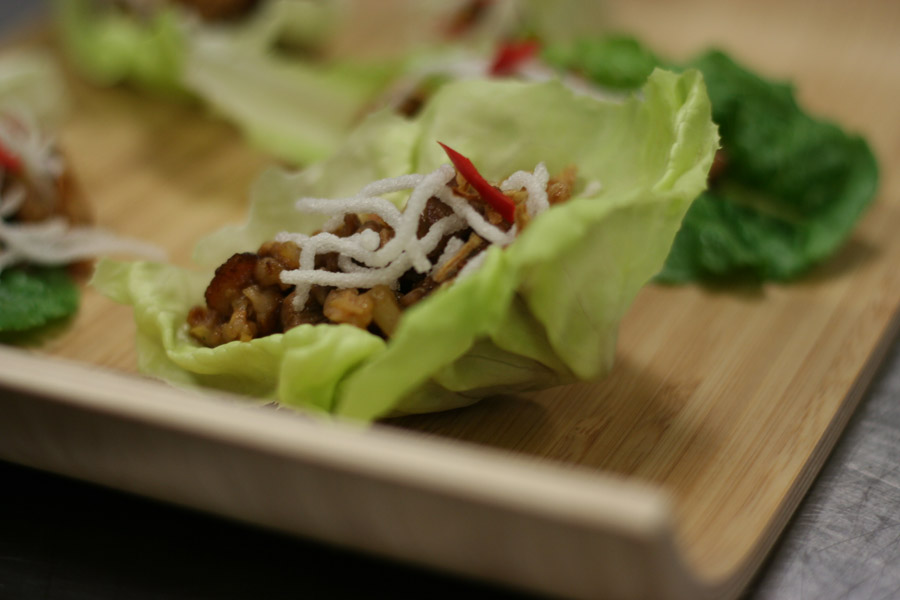 The aim is to have the contrast of chilled crispy lettuce with the fragrant warm duck mixture.